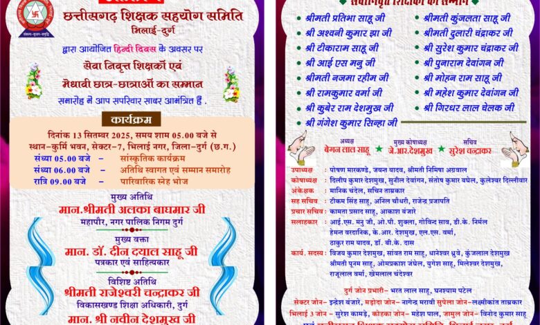 Read More »लक्ष्मीनारायण लहरे, रायपुरछत्तीसगढ़ शिक्षक सहयोग समिति भिलाई दुर्ग के तत्वावधान में प्रति वर्ष की भांति इस वर्ष भी हिन्दी दिवस…