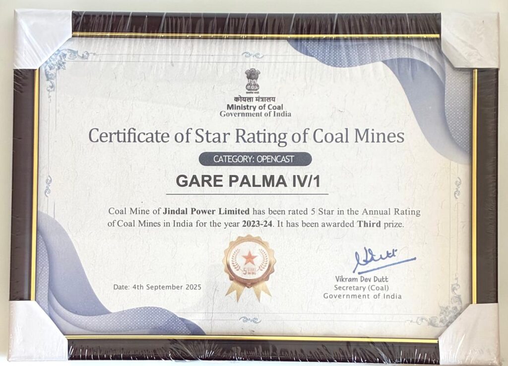 जिंदल पाॅवर लिमिटेड तमनार की गारे पालमा 4/1 कोल माइन्स को लगातार दूसरे वर्ष मिला ’5 -स्टार रेटिंग’ अवार्ड